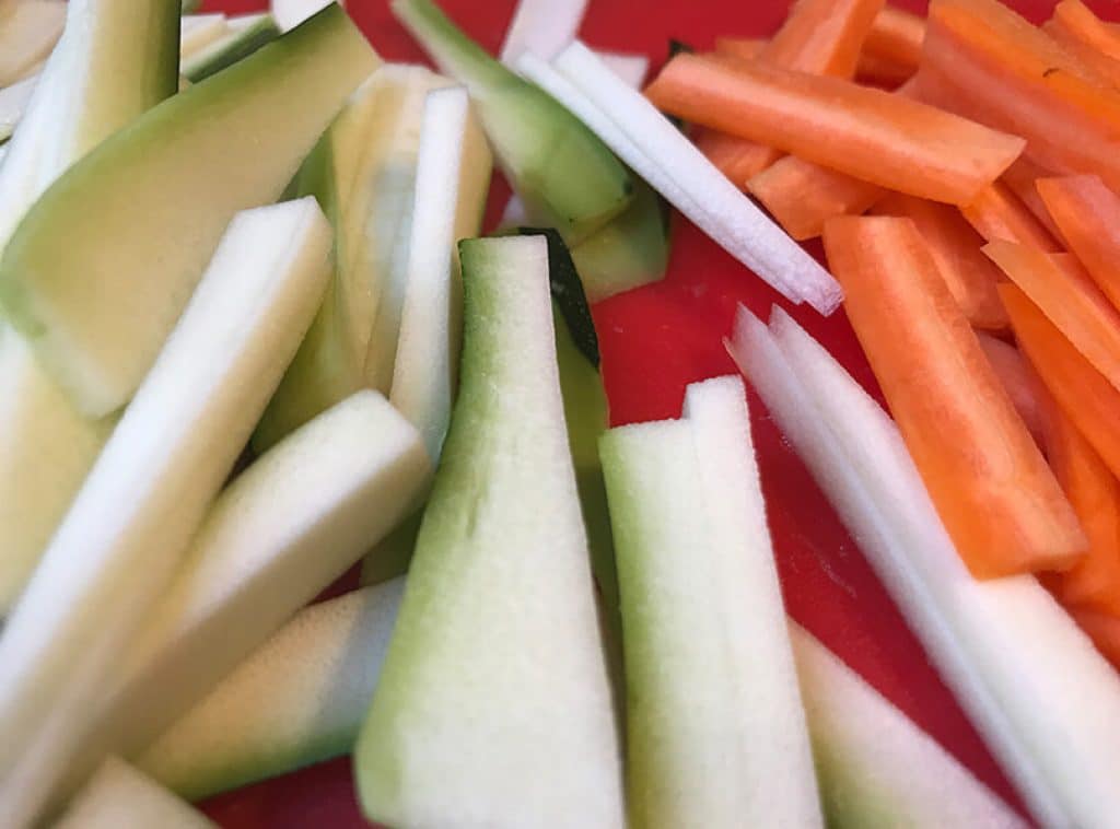 Pelar y cortar en dados finos la otra mitad de la cebolleta. Lava y pela el calabacín y las zanahorias y córtalos en tiras finas.