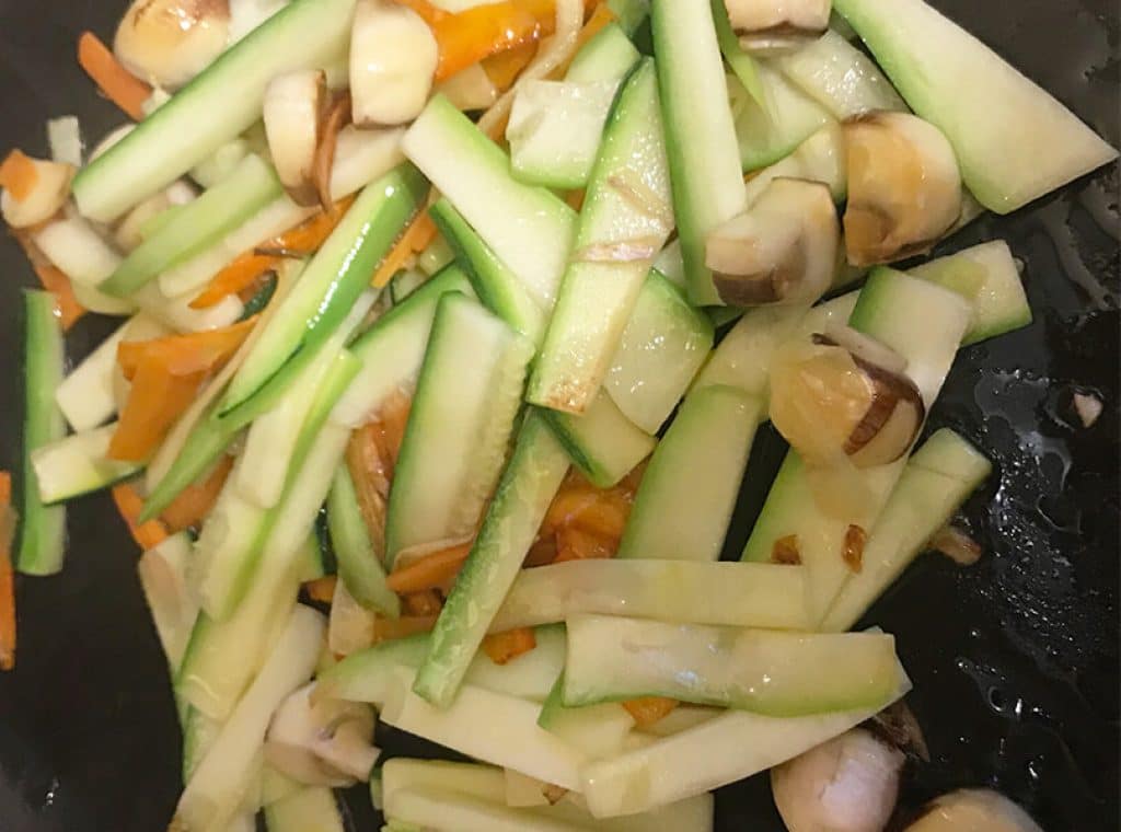 Calentar el aceite de oliva en una sartén, saltear la chalota y las zanahorias. Añadir el calabacín, saltear unos 5 minutos a fuego medio, remover.