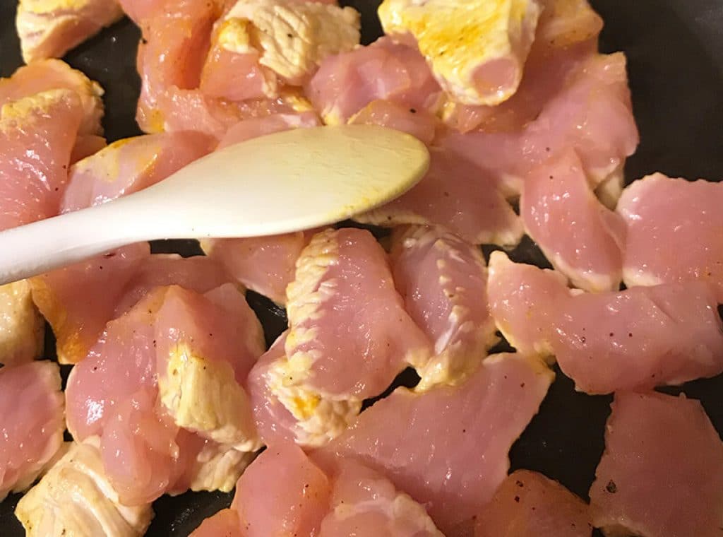 Mientras tanto, lava el filete de pechuga de pavo, sécalo y córtalo en tiras. Sazona con sal, pimienta y cúrcuma y mézclalo todo.